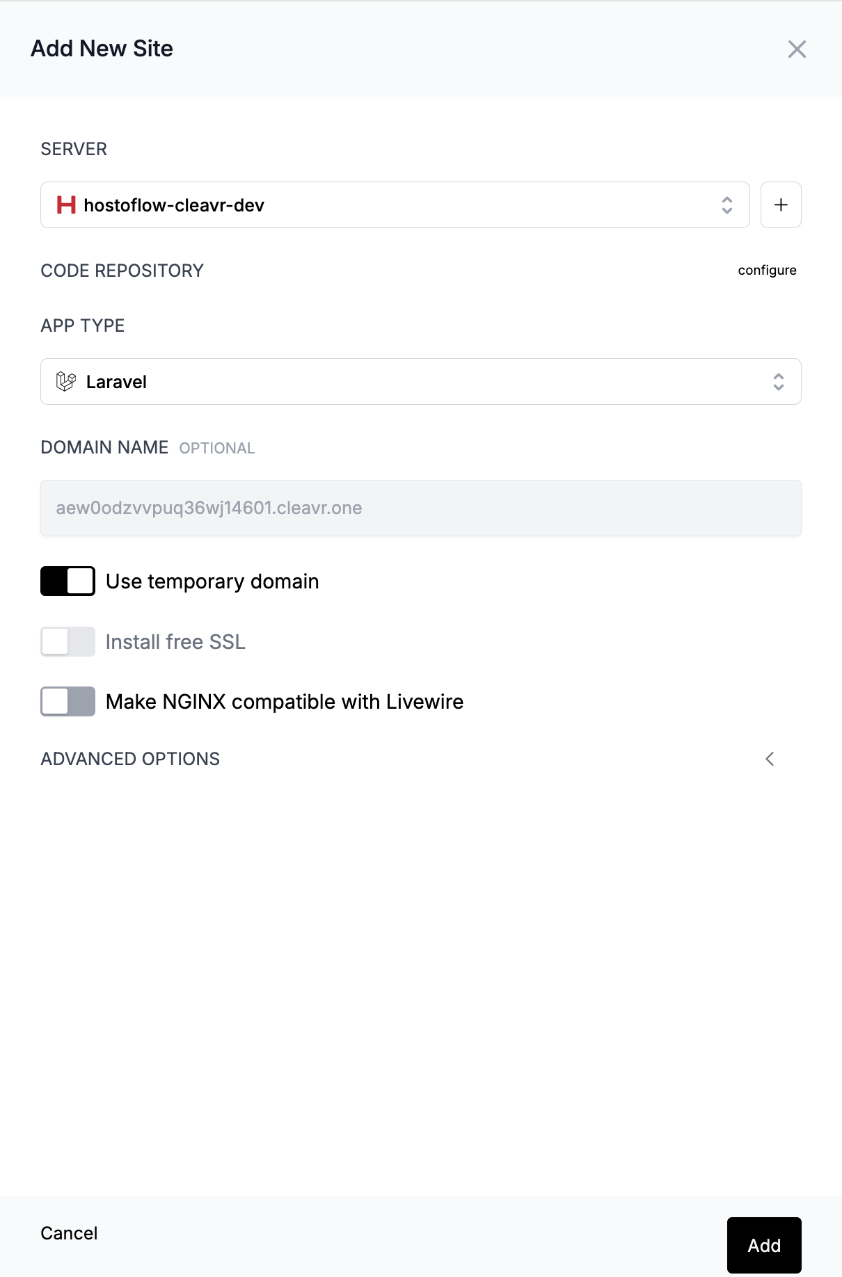 Please try refreshing the page and adding a new site again. After a few attempts, you should be able to get the cleavr.one domain.
